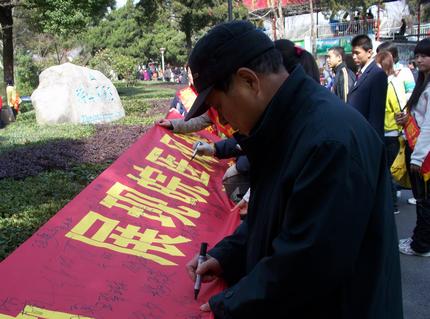 活动中,同学们高涨的热情,十足的干劲,也吸引了众多热心的市民参与,在宣传横幅上签名,同时表示了对我系此次活动的支持和认同。