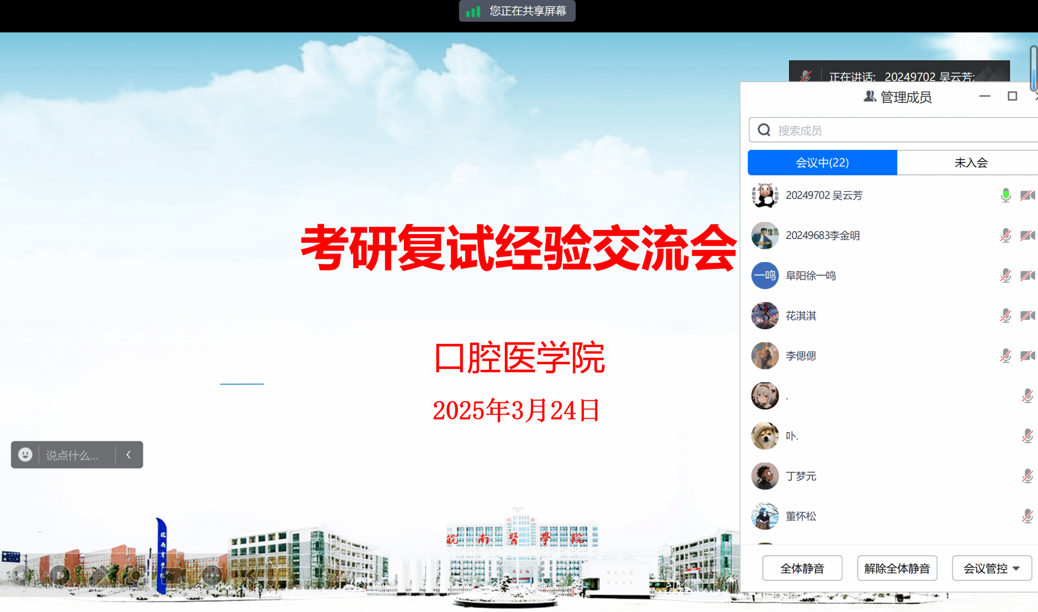 3月24日晚,口腔医学院通过腾讯会议举办2025届毕业生考研复试经验交流会,为准备考研复试的同学提供全面、实用的复试指导,助力他们顺利通过考研复试,开启学术深造新征程。已上岸的研究生代表、毕业班辅导员王杰及全体进入复试的毕业生参加会议,会议由王杰主持。