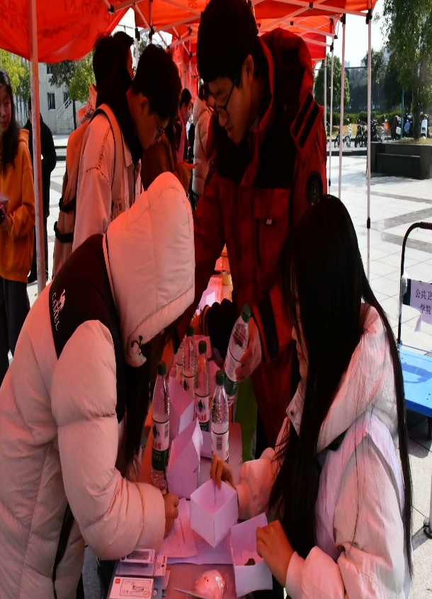 为积极响应全民健康素养提升行动号召,增强同学们在营养饮食、科学运动、心理健康调适、疾病预防等方面的知识储备,3月20日,公共卫生学院学生会于老食堂门口举办了以“遇见健康,青春同行”为主题的“健康盲盒欢乐抽”活动。活动现场“健康盲盒”内设置了350个活动内容纸条,每张纸条含有健康内容任务卡片,涵盖运动打卡、营养膳食、规律作息三大领域,极富趣味和挑战性。参与者随机抽取任务卡,完成挑战即可获得健康礼品。本次活动采用“任务+解析”的创新模式,将健康理念融入趣味互动中,借趣味盲盒,引导学生参与健康任务,进而纠正认知误区,帮助同学们养成良好健康习惯,提升个人健康素养。