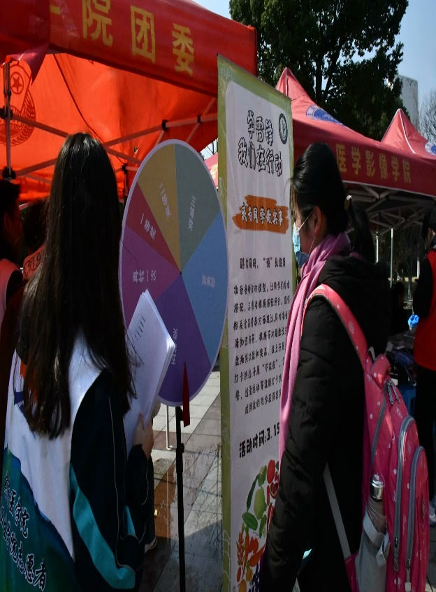 3月15日,公共卫生学院于老食堂门口开展"膳食解码,'预'见健康"主题活动,帮助同学们了解日常饮食的营养搭配,培养健康饮食习惯。志愿者团队通过食材模型展示、营养配餐实操、健康知识问答等互动形式,将《中国居民膳食指南》的专业知识转化为生动实践。活动现场,同学们在志愿者指导下完成个性化膳食搭配,获得专业营养评估和建议,在趣味互动中掌握了科学饮食的要领。新颖的活动形式吸引了同学们踊跃参与,成为校园健康促进的创新实践。同时开展的健康知识问答环节,通过趣味竞答的方式帮助同学们掌握实用的营养知识,参与者还能通过转盘抽奖获得健康小礼品,现场气氛热烈欢快。