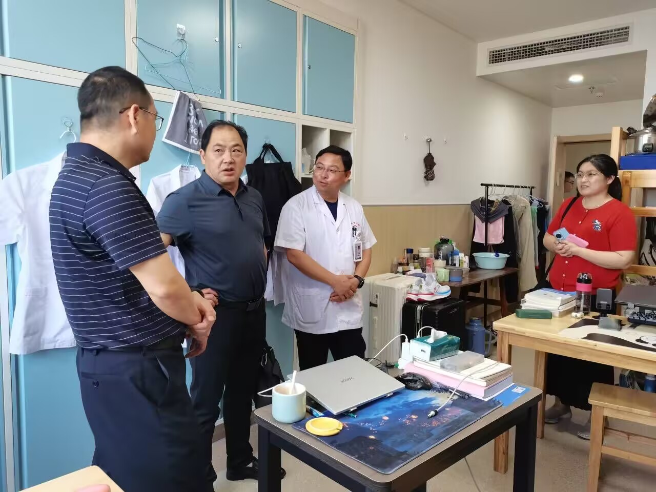 在六安市第二人民医院,走访组与医院领导、科教处负责人、实习生等进行座谈。医院相关负责人介绍了实习生的学习实践和生活保障情况,双方就实习基地建设、法医人才培养等进行探讨。走访组还深入学生宿舍和自习室,实地查看学生学习和生活情况,嘱咐学生遵守医院规章制度,勤学善思好问,与带队老师保持有效沟通交流。