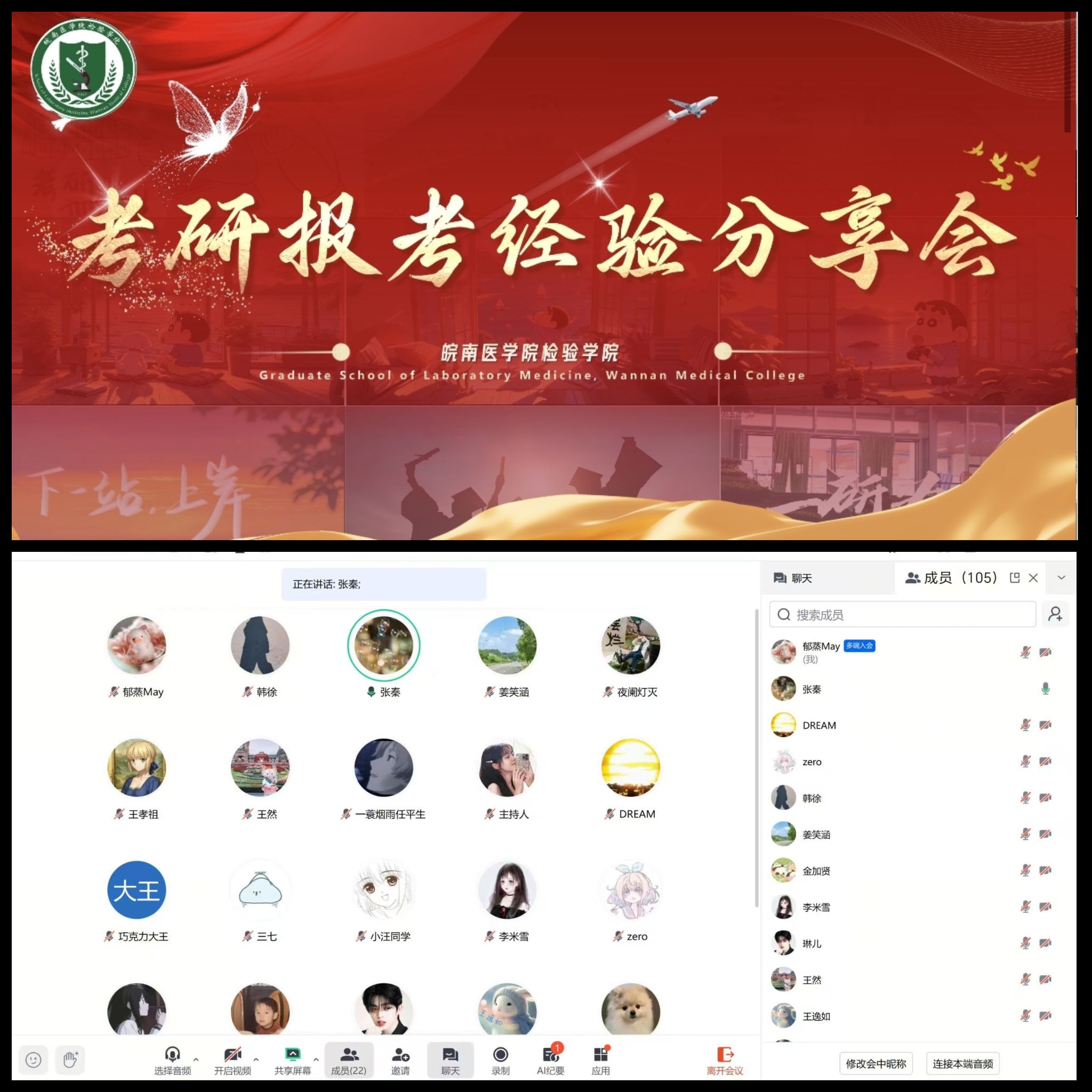 为精准助力2026届考研学子科学择校与报考,9月25日晚18:00,检验学院线上举办了考研院校报考经验交流会。会议特邀六名往届成功考取硕士研究生的同学担任主讲,围绕考研院校与专业选择这一核心议题进行深入分享,学院百余名有志于考研的同学积极参与。