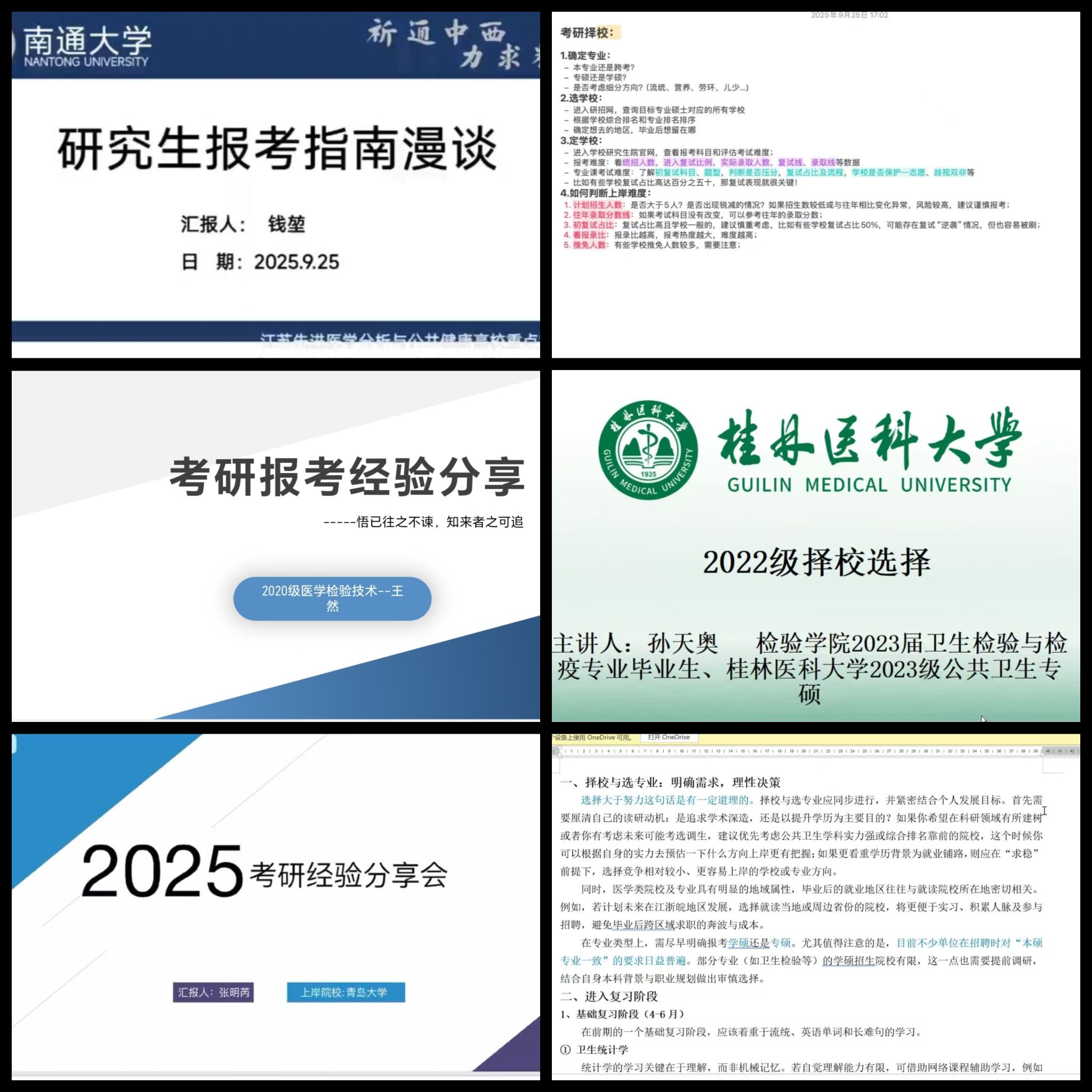 本次参与分享的六位同学升学去向涵盖了南通大学、东南大学、桂林医科大学、青岛大学、新乡医学院等不同地域、不同层次的高校,为在校同学提供了丰富多样的院校报考样本。学长学姐们紧密结合自身报考经历,重点分享了院校与专业选择的策略与心得,详细讲解了如何结合个人职业规划、学术兴趣与自身实力,科学确立目标院校层次;如何综合评估院校地域、专业排名、招生政策、报录比等关键信息,以规避报考风险、做出最优选择。此外,他们还介绍了备考安排与调剂注意事项,为学弟学妹们构建了清晰实用的报考决策框架。