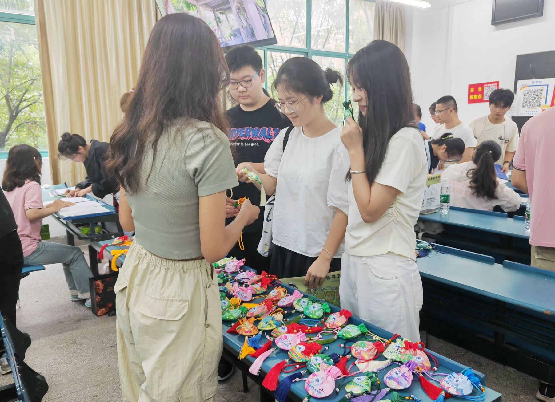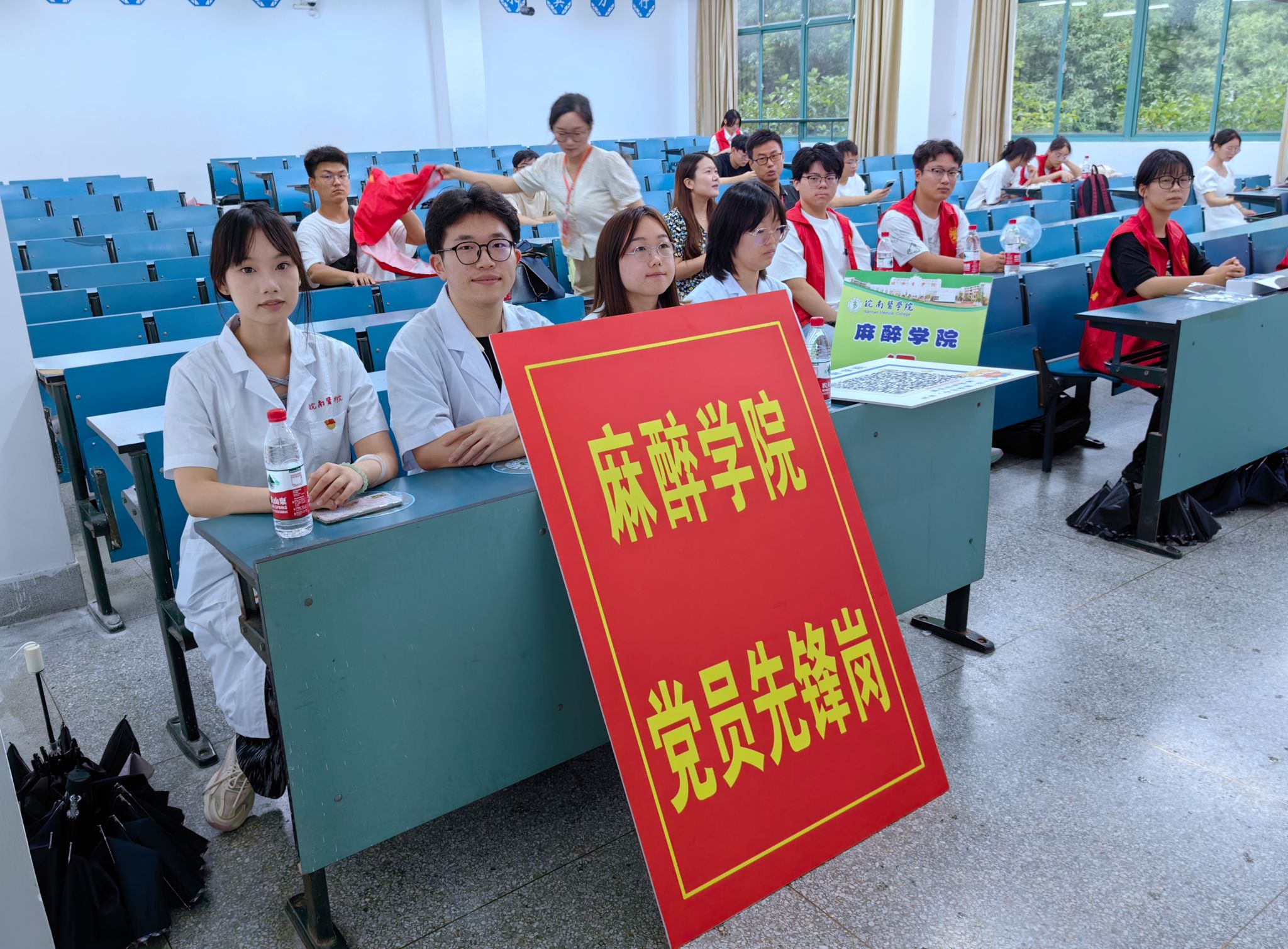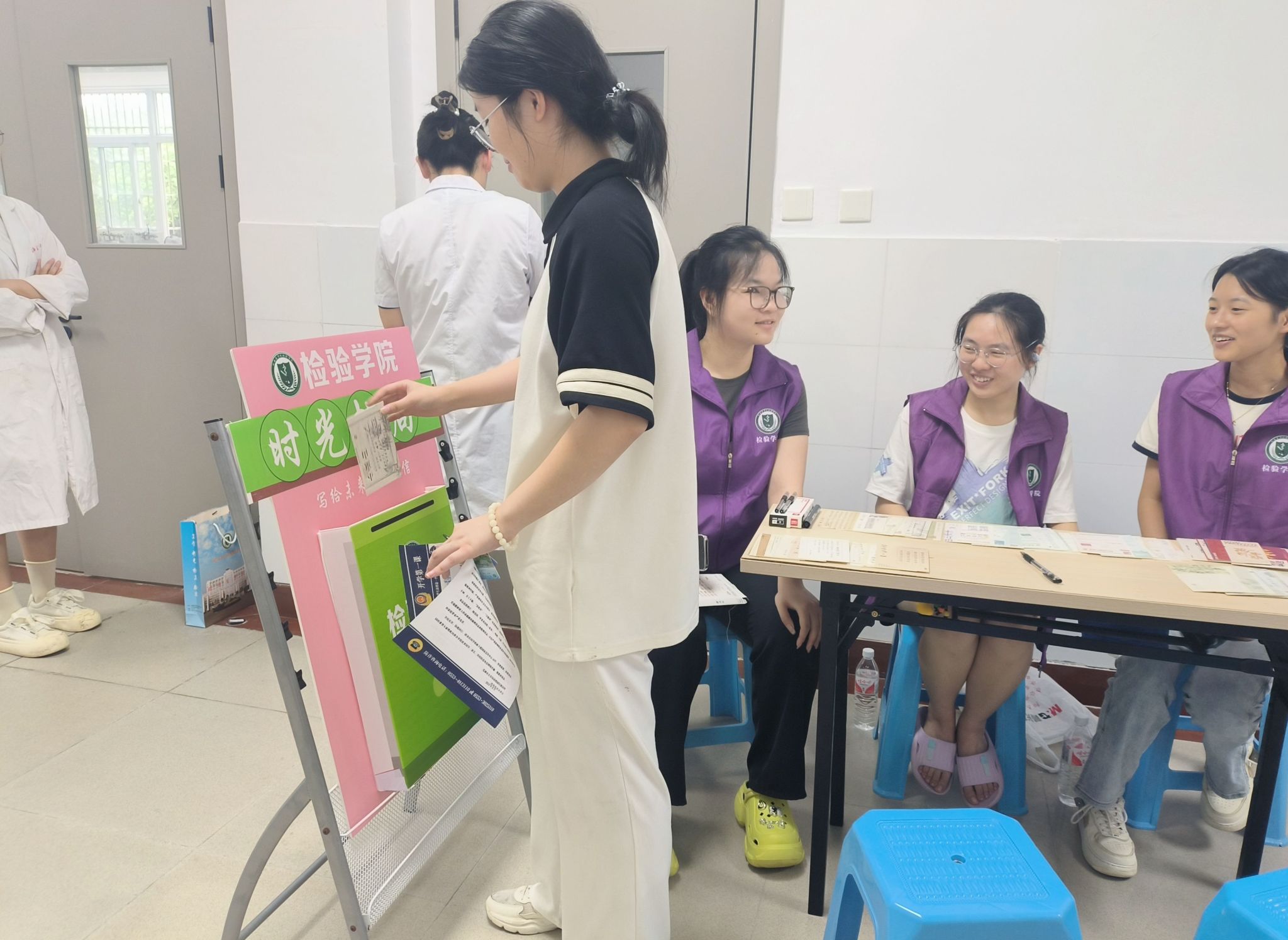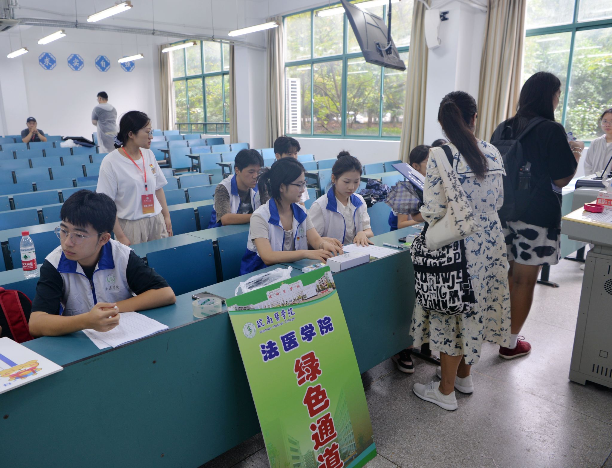各二级学院根据自身学科特色、学院文化等特点,纷纷设计了别出心裁、充满趣味性的迎新活动:药学院将专业思政与迎新相结合,现场展示学生野外采集的中草药标本,并为每位新生准备精美的驱蚊中药香囊;医学影像学院制作“生命之树”签到板,每位新生在上面留下自己的签名和指纹,共同构成了茂盛的枝干和树叶,寓意着每个人都是集体的一员,同时也都是独一无二的;基础医学院举办基础医学优秀人文作品展,来进一步激发学生的学习兴趣;检验学院在新生报到处设置“时光邮局”,组织新生写下对大学生活的憧憬和目标并投入邮局,待到毕业时再开启看看自己是否达成了最初的梦想;麻醉学院为每一位新生赠送了带有“皖医”属性的扇子和入学卡片,融入了皖医精神、校训、学业生涯规划、职业去向、大学生活内容等信息,让新生进校之初就接受一次“润物无声”的入学教育。